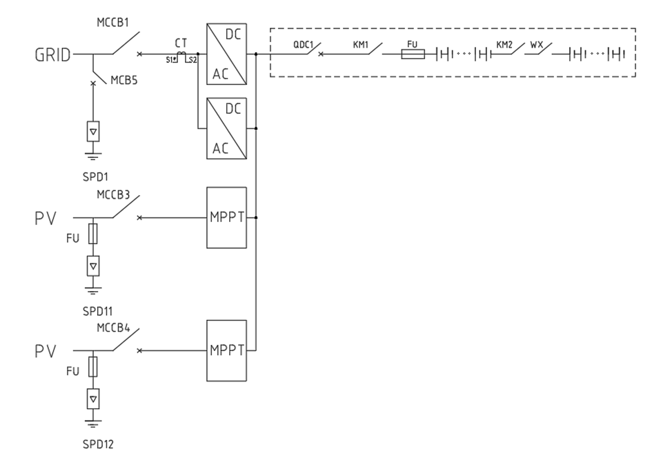 | 14 | Overspanningsbeveiliging – AC-zijde | Beschermt de AC-ingang tegen bliksem en spanningspieken. |