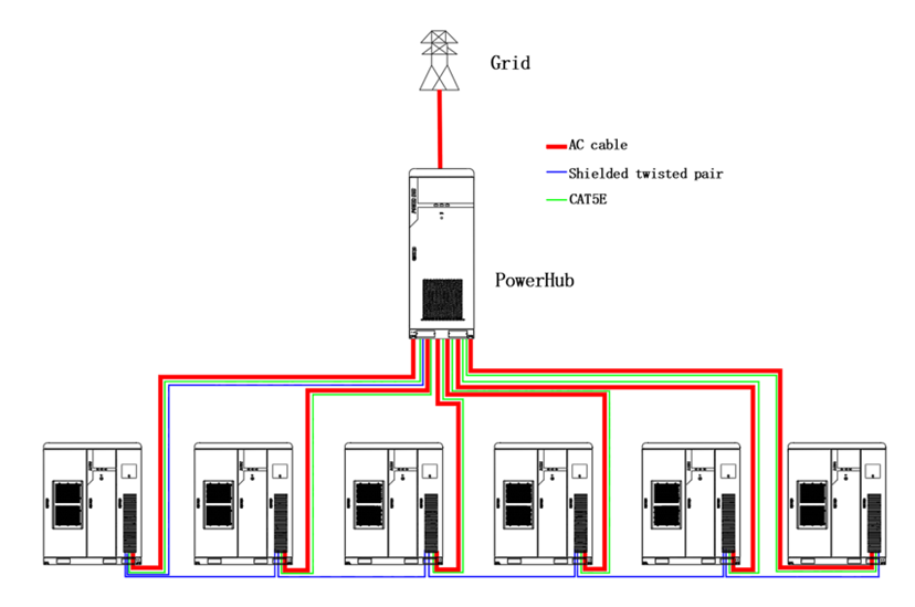Communicatie verloopt via Modbus TCP of RS485 (Modbus RTU) tussen de BOLT-cabine en andere energiebronnen zoals PV-omvormers of generatoren.
