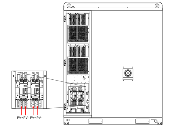 De bekabeling moet strikt worden uitgevoerd volgens de polariteitsaanduidingen (+/-) die zijn gemarkeerd op de onderste busbar van de PV-circuitbreaker.