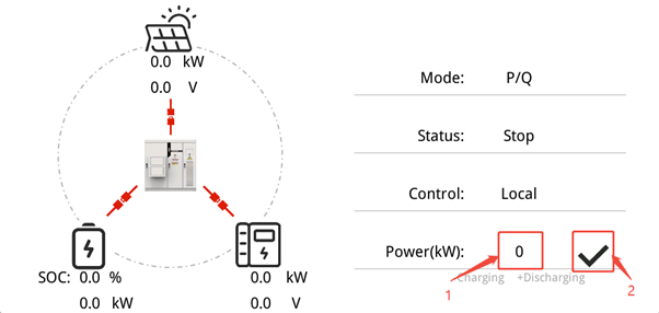 Voer het gewenste vermogen (positief = ontladen, negatief = laden) in.