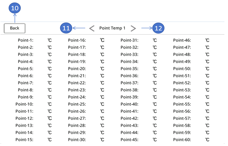 | 11–12 | Bladeren celtemperatuurpagina | Naar vorige/volgende pagina enkelceltemperaturen |