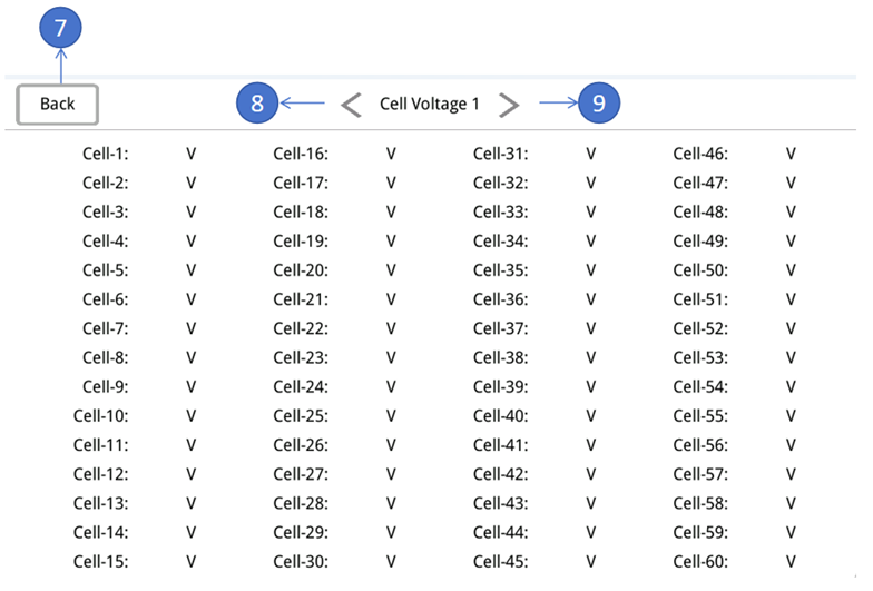 | 8–9 | Bladeren celspanningspagina | Naar vorige/volgende pagina enkelcelspanningen |