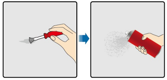 | Lichte krassen (zonder blootliggende staalbasis) | Handsprayverf of verf met kwast (voor kleine oppervlakken), fijn schuurpapier, watervrije ethanol, katoenen doek en spuitpistool (voor grotere oppervlakken). | Volg stap 1 + 2 + 4 + 5 | 1. Voor kleine krassen, vlekken of lichte roest: gebruik handspray of kwast. 2. Voor grotere oppervlakken of veel krassen: gebruik een spuitpistool. 3. De verflaag moet dun en egaal zijn, zonder druppelvorming. 4. Wacht ca. 30 minuten na het aanbrengen voordat verdere stappen worden uitgevoerd. |